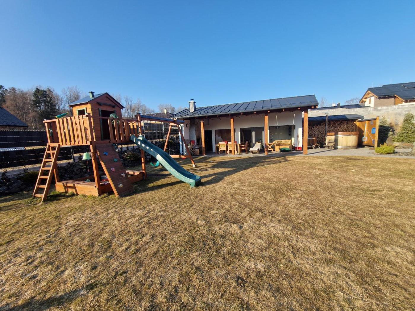 For guests with children, the chalet features outdoor play equipment. Guests can also warm themselves near outdoor fireplace after a day of skiing.